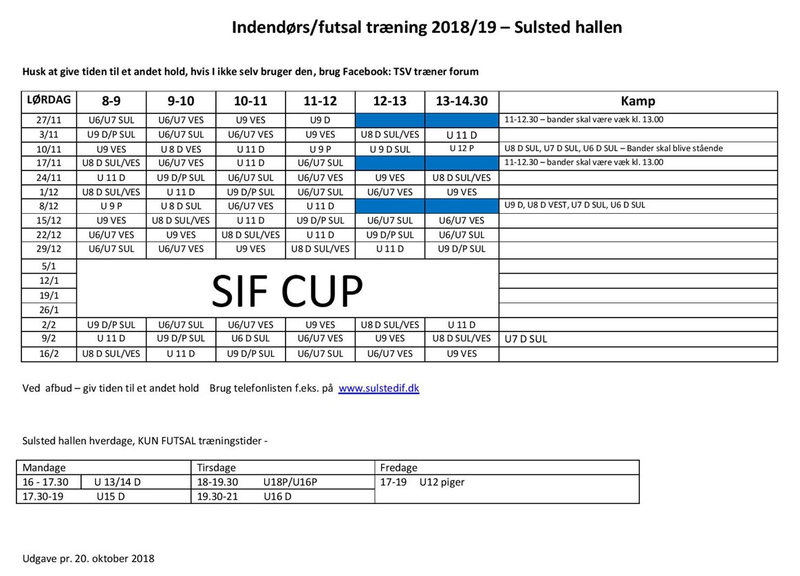 Indendørs og Futsal træningstider for 2018/19 i Sulsted hallen