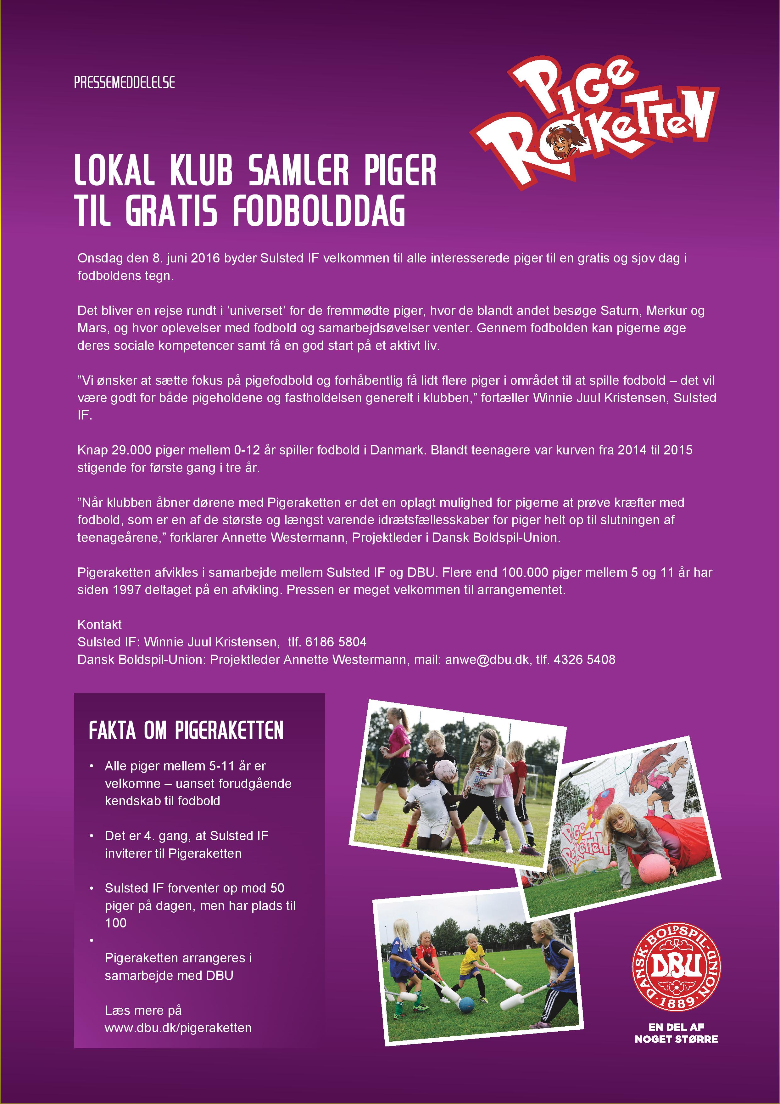Pige-Raketten, kommer til Sulsted Stadion onsdag den 8. juni 2016 fra kl. 17.00 til kl. 19.30.